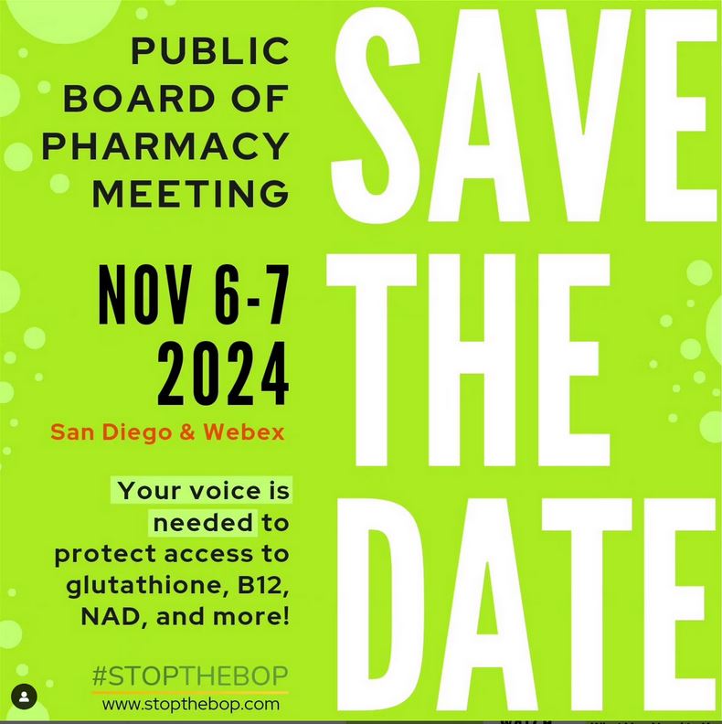 On November 6-7, the California Board of Pharmacy (BOP) is expected to vote to restrict access to safe and critical Category 1 substances like glutathione, NAD+ and methylcobalamin (the active and most bioavailable form of vitamin B12).