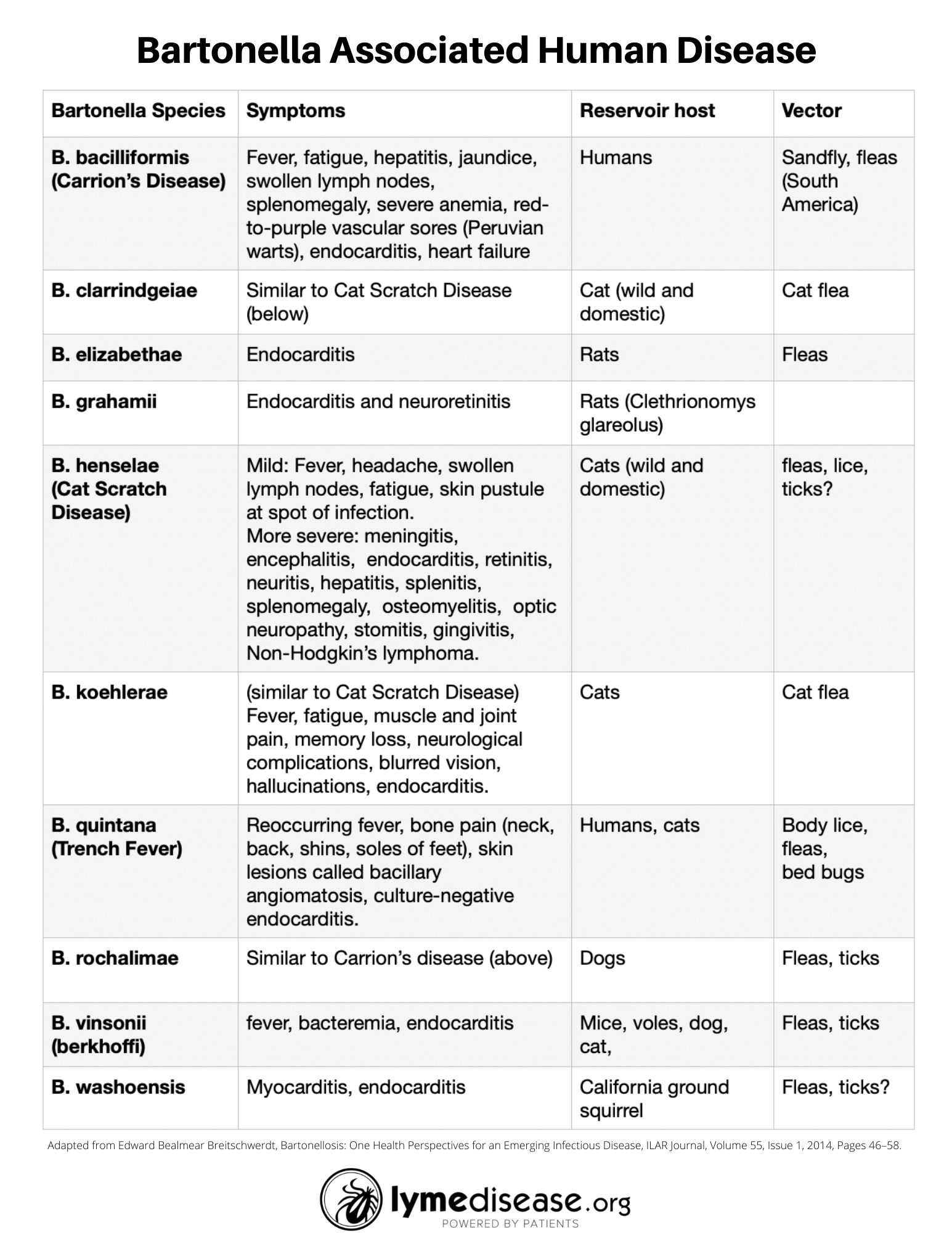 The table below lists the known species of Bartonella associated with human disease, the most common symptoms as well as the reservoir host and vector.