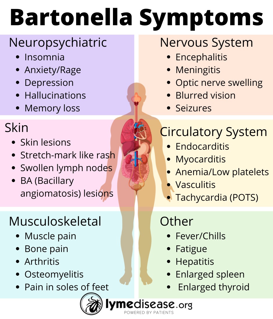 At a recent conference, Dr. Ed Breitschwerdt, DVM, a leading expert in the field,  explained how Bartonella can invade and “literally affect every system in the body.” This includes the: cutaneous, muscular, skeletal, endocrine, cardiovascular and nervous systems.