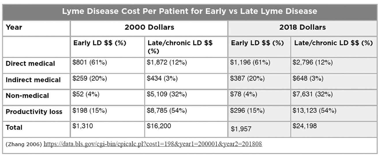 When the total costs (direct medical, indirect medical, non-medical, and loss of productivity costs) of acute ($1.8B) and late/ chronic Lyme disease are combined, they aggregate to between $25.8B to $73.8B.