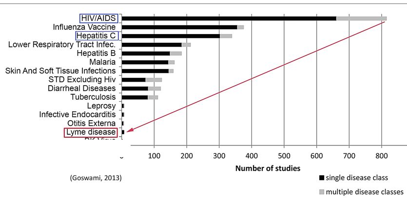 Although the incidence of Lyme disease (300,000) is nearly 8 times higher than the number of people diagnosed with HIV/AIDS each year in the US (38,500), the number of clinical studies for Lyme disease trails behind leprosy, which has an incidence of fewer than 200 cases a year. (CDC 2016, Health Resources and Services Administration).