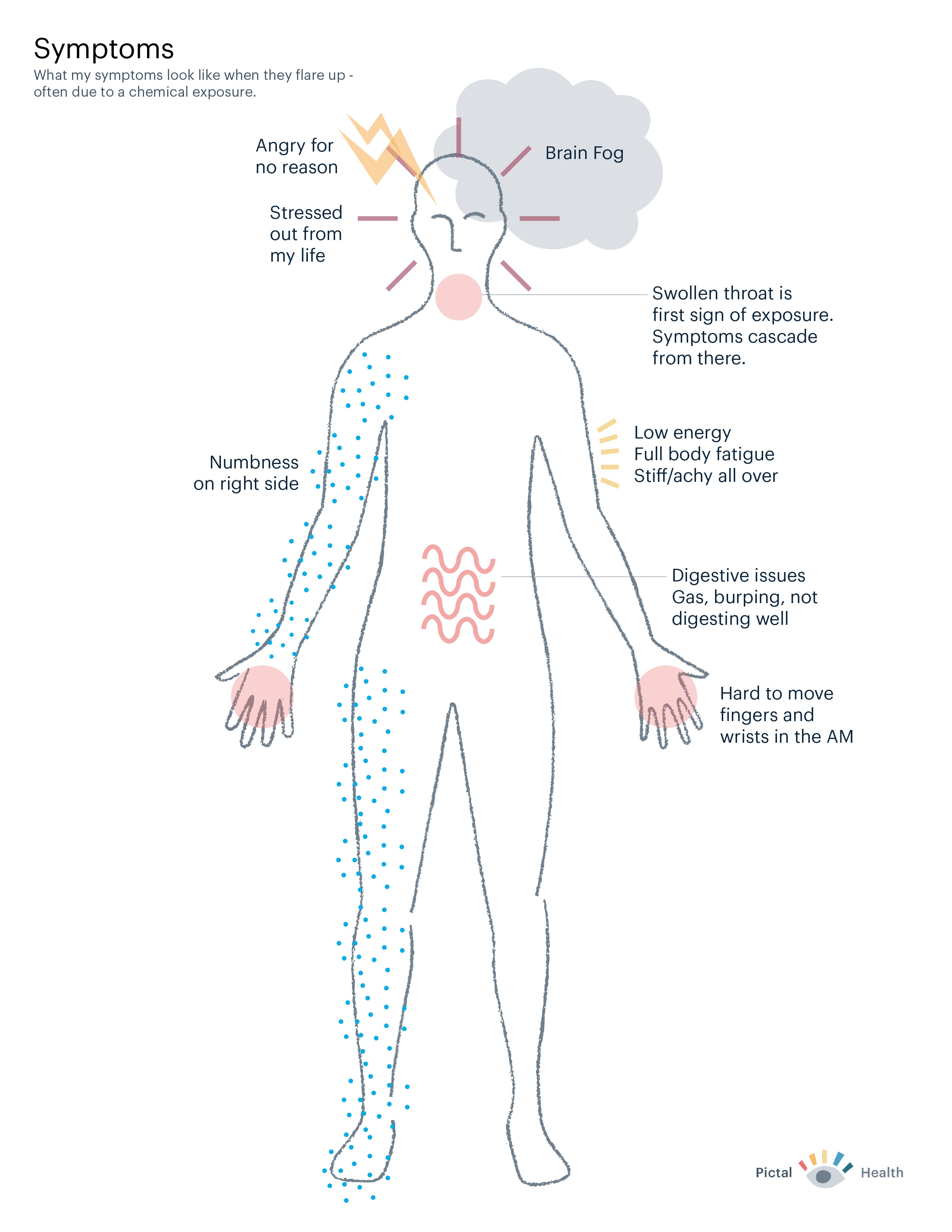 We mapped her symptoms to a body outline, using a mixture of shapes and words to communicate about how she felt. This was an important alternate view of her health, as it highlighted how chemical exposures were a key symptom trigger.