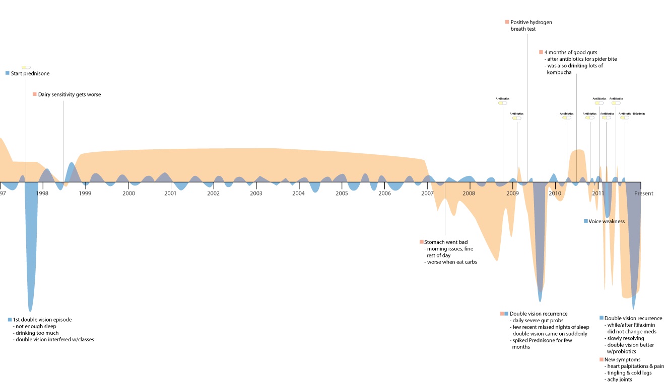 Along the way, I began experimenting with creating visuals of my symptoms and history. This helped me tell a more coherent story and give my doctors another way of “seeing” what was going on with me.