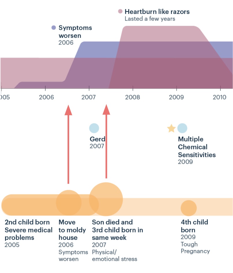 It showed when her symptoms started, when they got worse, and how environmental issues (mold) and life stressors seemed to exacerbate them. Here’s one part of her timeline: