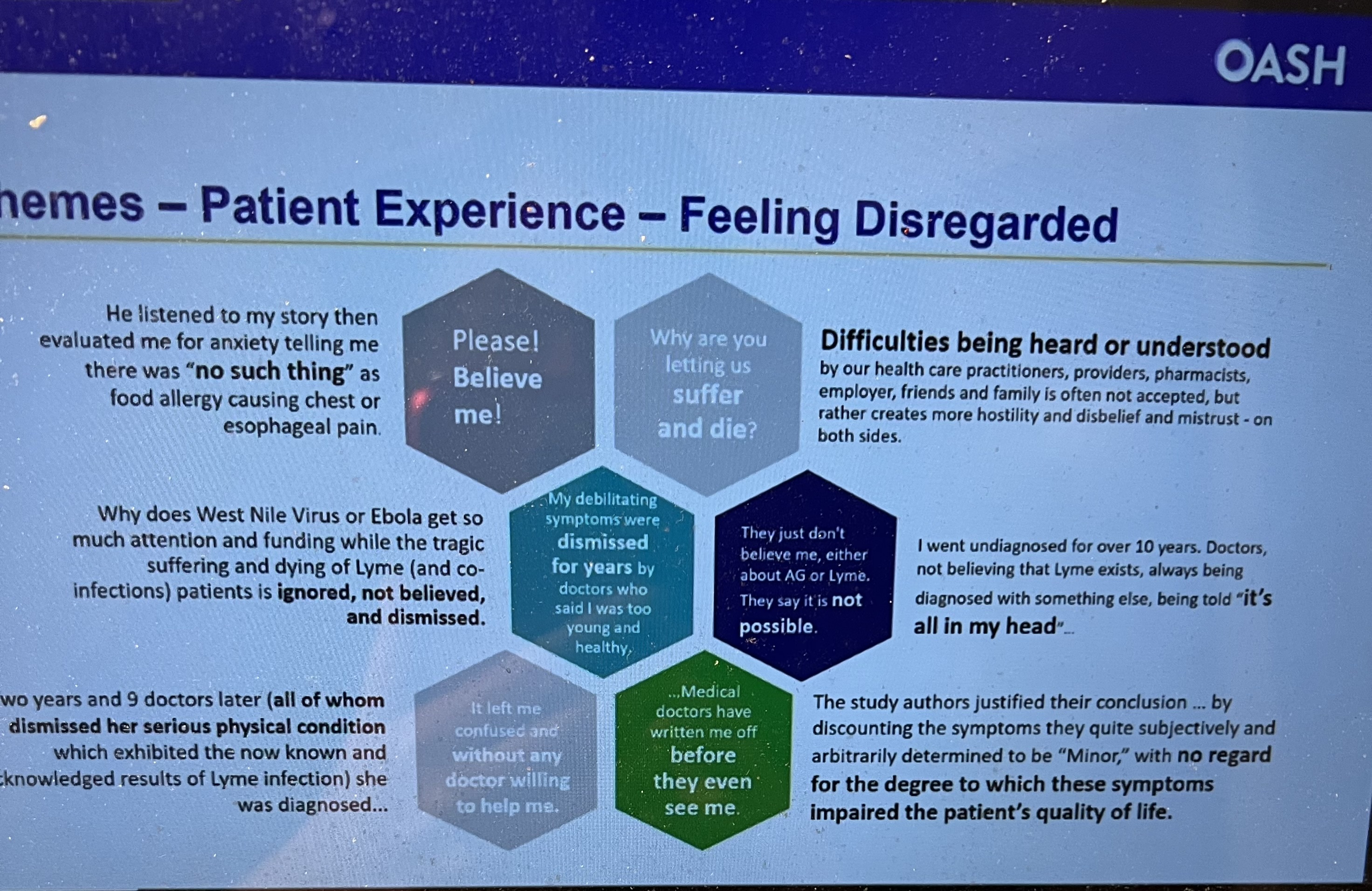 (3.) One intriguing presentation summarized more than 1300 written comments delivered to the panel since it started in 2017. Messages were analyzed for content, put into categories (such as patient experience, ethics, resources), and further classified by theme (such patient feeling disregarded, diagnostic criteria, misdiagnosis by geography, mental health). It was an effective way to showcase the opinions and concerns of varied members of the Lyme community. Bravo to HHS staffer Lauren Overman and the subcommittee for a job well done.