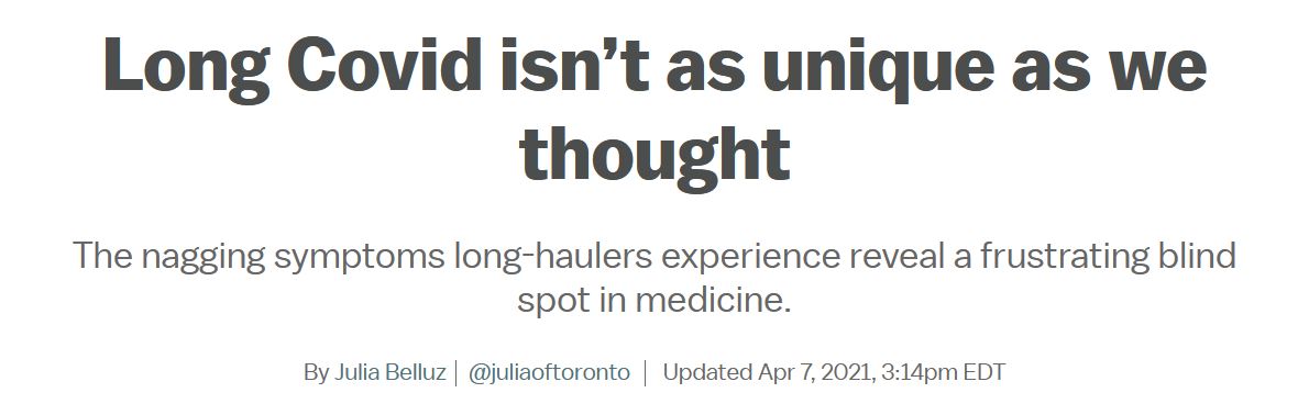 The subheading on this article by Julia Belluz sums it up nicely: “The nagging symptoms long-haulers experience reveal a frustrating blind spot in medicine.” (Hear, hear.) She states: