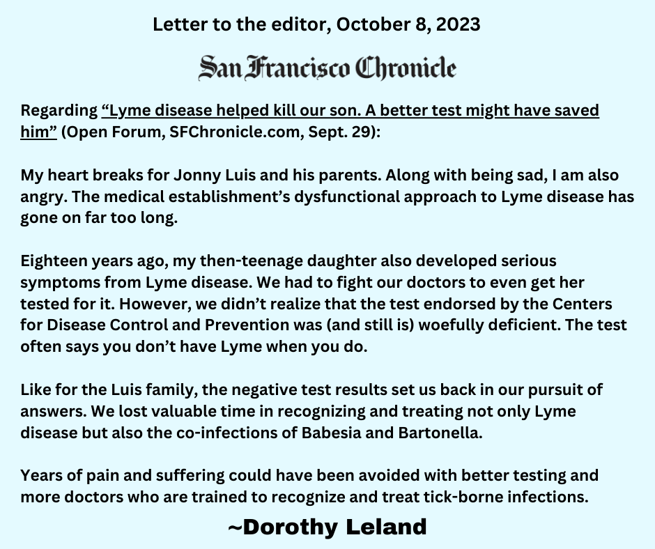 Eighteen years ago, my then-teenage daughter also developed serious symptoms from Lyme disease. We had to fight our doctors to even get her tested for it. However, we didn’t realize that the CDC-endorsed testing protocol was (and still is) woefully deficient. Their test often says you don’t have Lyme when you actually do. Like for the Luis family, the negative test results set us back in our pursuit of answers. We lost valuable time in recognizing and treating not only Lyme disease, but also the co-infections Babesia and Bartonella