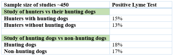 A combination of studies out of the Netherlands found that hunters and their hunting dogs had tested positive for Lyme disease at similar rates (17% hunting dogs vs. 15% hunters.)