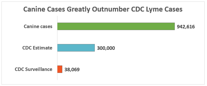 This means that there are roughly 25 times more canine cases than CDC surveillance cases. Even taking into account the fact that the CDC acknowledges that surveillance reports significantly underestimate the real incidence of Lyme disease by a factor of 10, the discrepancy is extraordinary. As the chart below reflects, canine cases are still more than three times the number of CDC estimated cases (300,000).