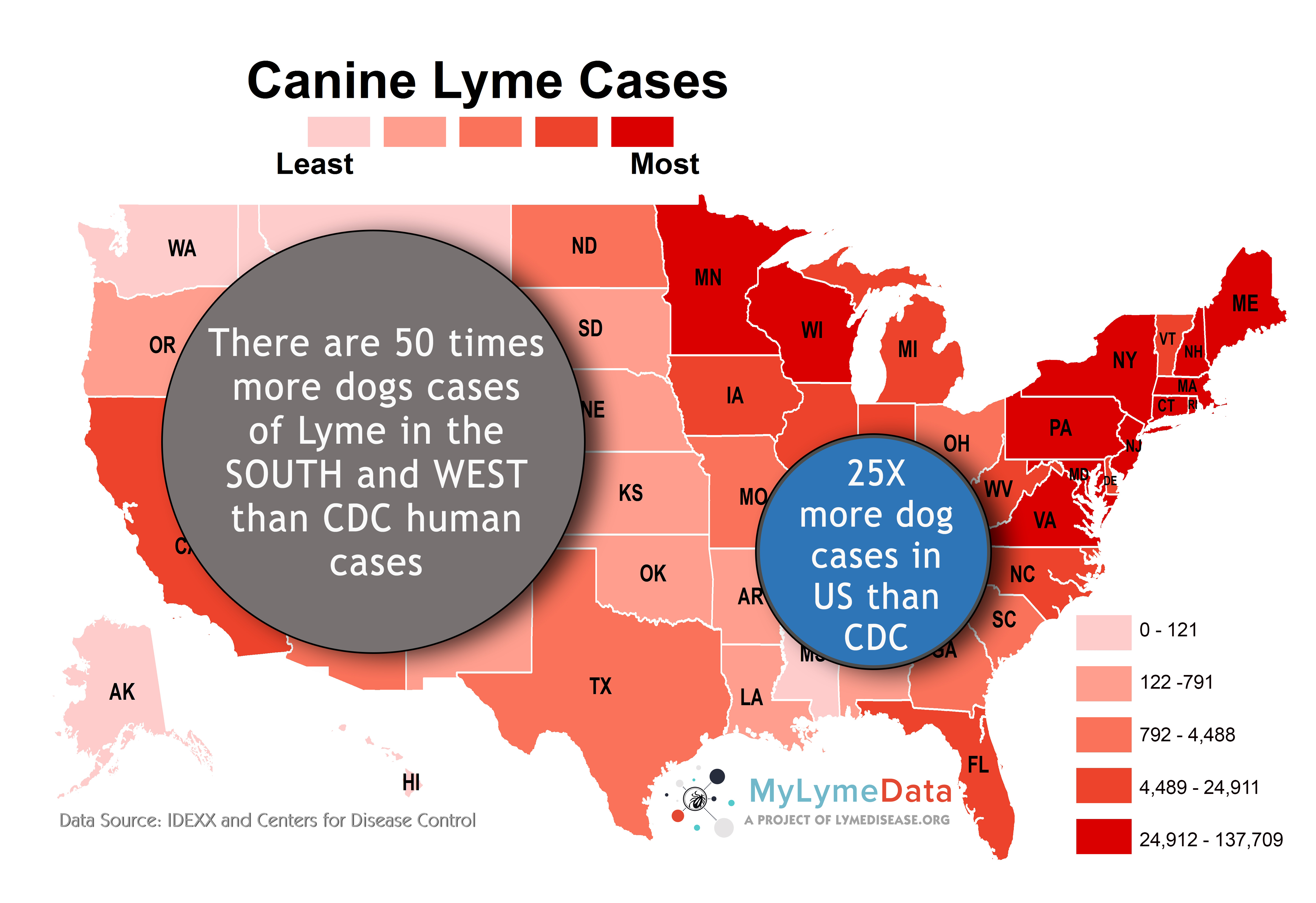 Unlike people, dogs are routinely screened for Lyme disease and other common co-infections by their vets. IDEXX has tracked Lyme disease and other tick-borne diseases in canines for years by collecting data from veterinarians who test dogs at annual check-ups.