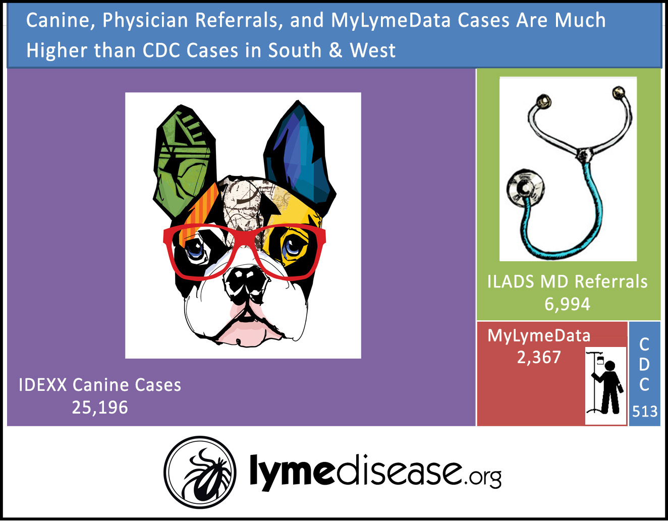 We then looked at other sources of data suggesting risk–including the number of dogs reported by IDEXX who test positive for Lyme, and the number of patients who requested physician referrals from the International Lyme and Associated Diseases Society in that state. Remarkably, we found that every one of these other sources reflected higher numbers of cases in the South and West than the CDC did—sometimes by a staggering amount. Consider, for example, the number of CDC cases compared to the IDEXX canine cases.