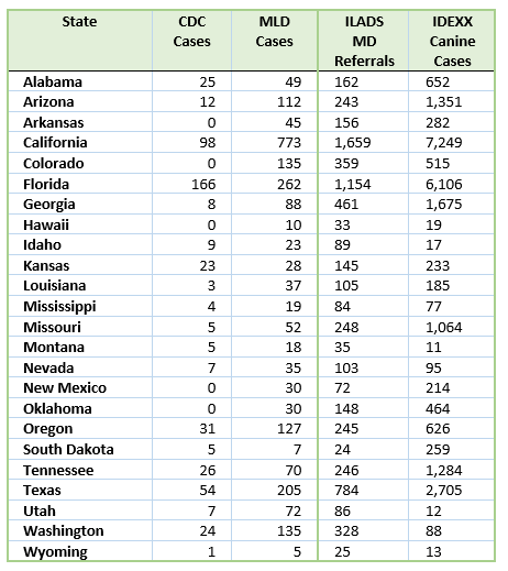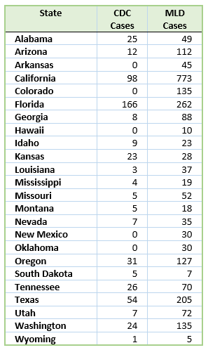 The table below shows how various data sources compare to the 24 states where MyLymeData reports more cases than the CDC reports.