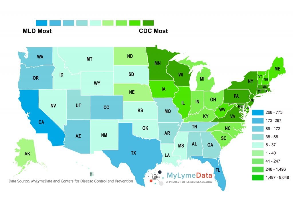 There are some important differences in the MyLymeData and the CDC statistics. MyLymeData collects information from participants regardless of when they were infected, while the CDC reports are for the year 2015. However, the MyLymeData cases included in the data collected by that time was 5,776—a far smaller sample size than the CDC’s (38,069). This means that the MyLymeData sample is about one-seventh of the cases reported annually by the CDC. Ordinarily, CDC cases should surpass MyLymeData cases across the board in every state just because their sample is so much larger.