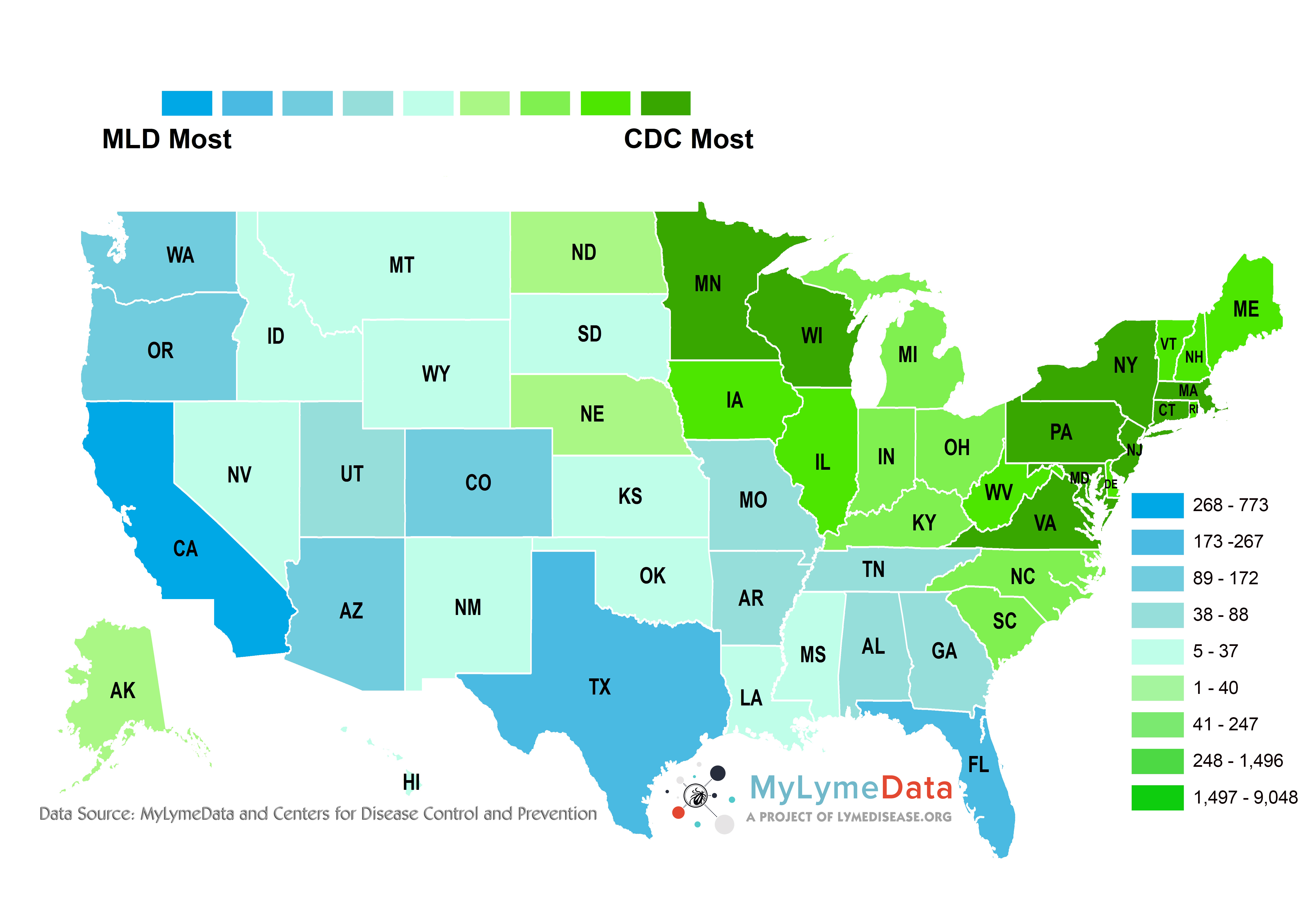 On the map below, the states in blue have a higher number of people enrolled in MyLymeData than are included in total CDC case reports. (In green states, the CDC has more cases.) The differences reflected on the map suggest a broad pattern of underreporting by the CDC of Lyme disease in the South and the West.