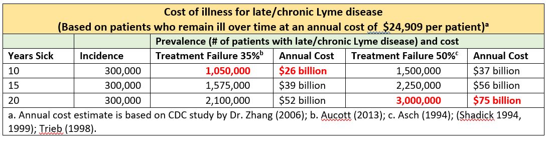 At 1 million cases of chronic Lyme disease, the annual cost is roughly $25 billion and at 3 million cases of chronic Lyme disease, the annual cost is about $75 billion.