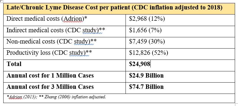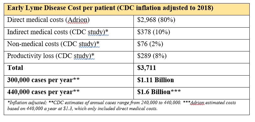 When we combine Adrion’s direct medical costs for early Lyme disease with the CDC’s inflation-adjusted indirect medical costs, non-medical costs and loss of work productivity for late/chronic Lyme disease, the total annual cost per person is about $25,000 ($24,909). See the table below.