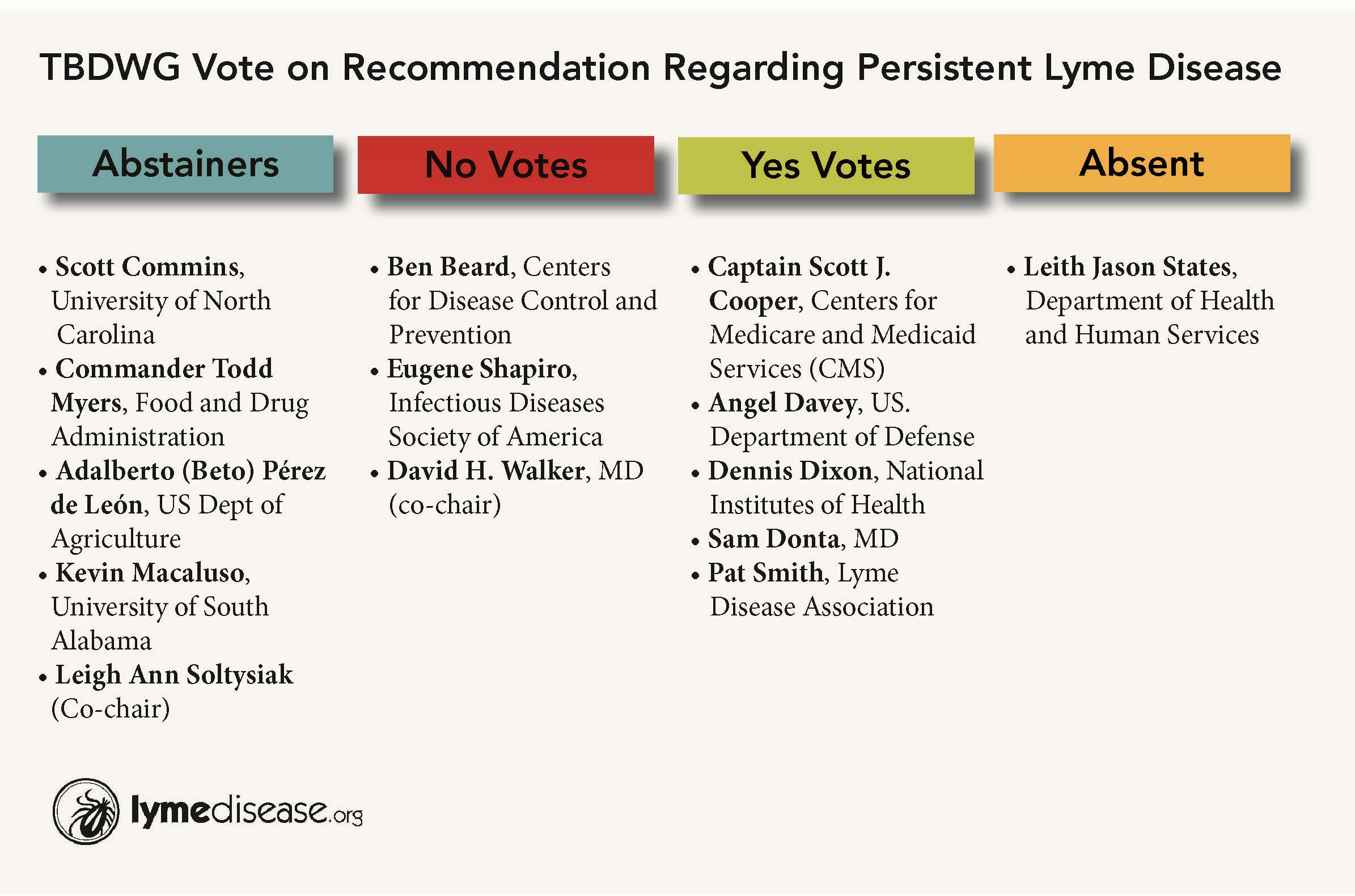 The recommendation regarding persistent Lyme disease was moved and seconded. Then, for unstated reasons, five panel members abstained from voting. The vote was announced as five abstaining, five yes votes and three no votes.