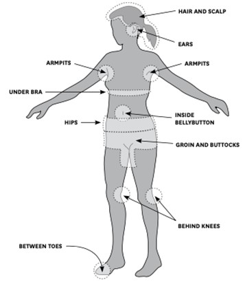 - Conduct a full-body tick check. Use sight and touch to sense for any ticks crawling on or attached to your entire body. Ticks are attracted to warmth and moisture, so make sure to search under your arms, behind your knees, between your legs, inside your belly button, between your buttocks, in your genitals, under your bra, around your waist, around and in your ears, on your head, and between your toes. Use a mirror or another set of eyes to check hard-to-see places.