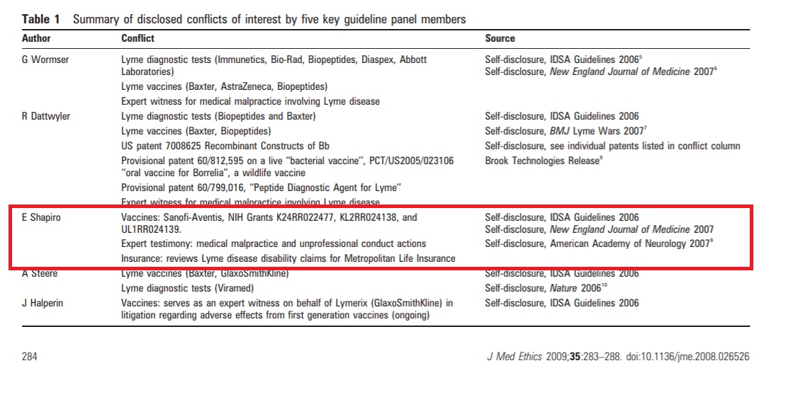 An article co-authored by Dr. Ray Stricker and Lorraine Johnson (both of whom are board members of LymeDisease.org) lists some of Shapiro’s financial conflicts of interest. (These conflicts are no secret. Shapiro himself has reported them in journal articles he has published.)