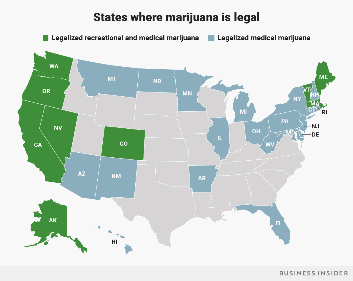 Recreational marijuana is legal in nine states and medical marijuana is legal in 29 states.