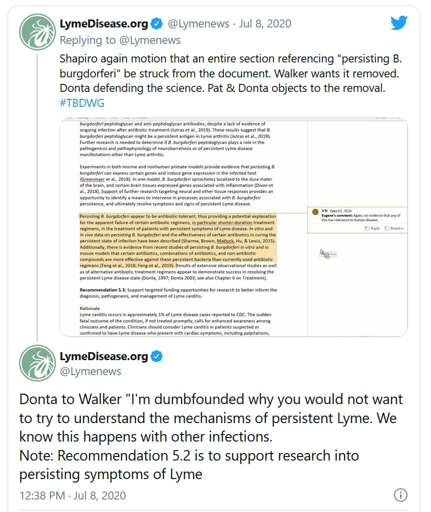Walker is an expert in rickettsial infections—not Lyme disease. At the first meeting of this Working Group in 2019, he announced that Lyme disease did not need to be included this time around because it had “already been covered” in the previous session of the TBDWG. Instead, he wanted this group to focus primarily on his issue—rickettsia—and other tick-borne conditions.