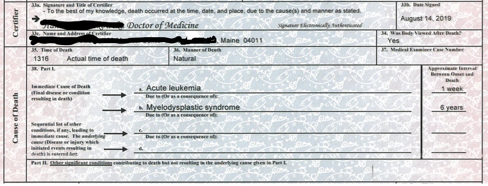 The cause of death on his certificate is listed as acute leukemia for one week and myelodysplastic syndrome for six years.